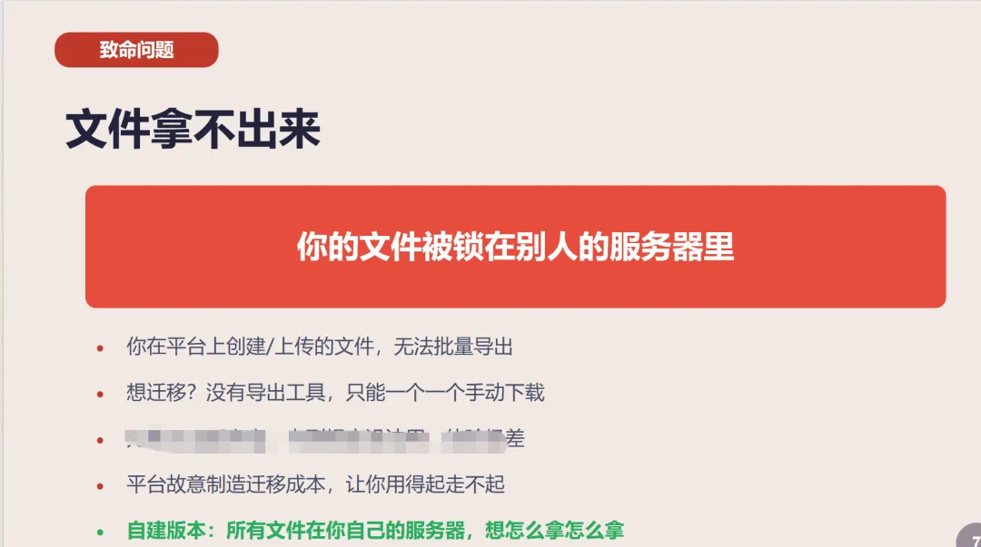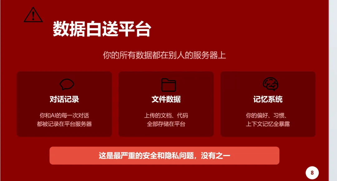• 平台有没有读你的数据?你不知道。 • 平台有没有用你的数据训练模型?你不知道。 • 平台倒闭了你的数据去哪了?你不知道。 • 平台被攻击了你的数据泄露了怎么办?你不知道。