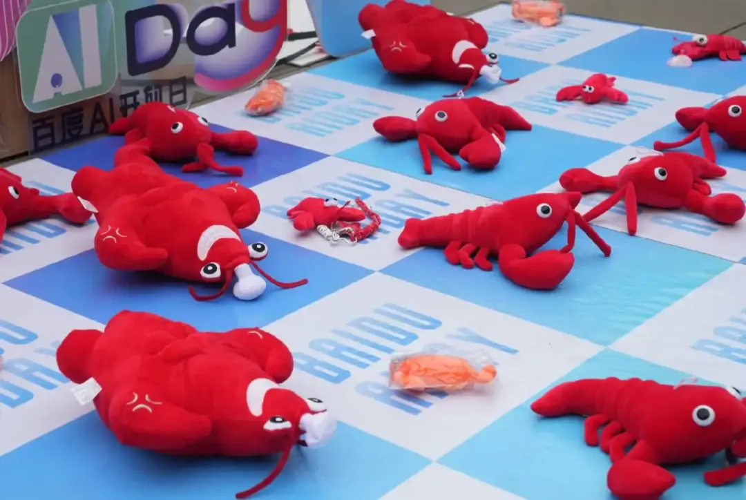 本月,在北京举办的百度OpenClaw「龙虾集市」活动上,现场摆放着以龙虾为主题的周边产品。