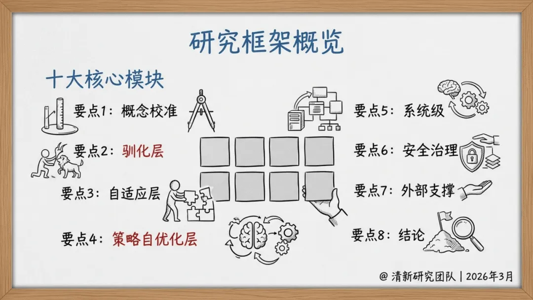 本报告由清华大学沈阳教授团队发布,聚焦OpenClaw人机协作系统,核心提出AI发展应遵循先驯化后进化理念,以权限决定能力边界为核心论点,将OpenClaw分为驯化、自适应、策略自优化三层架构。驯化层以最小权限、人工审核为核心,AI被动执行,依托本地存储与技能封装实现人机可控协作;自适应层AI可自主调整配置,实现自我改进;策略自优化层借助MetaClaw可更新模型权重、自主生成策略,效率显著提升。OpenClaw生态热度高,拥有大量技能与贡献者,配套NemoClaw、OpenShell等工具保障安全放权,采用分层安全治理机制,当前行业以驯化阶段为主,整体呈现权限渐进放权光谱,最终实现AI从人工管控到自主进化的有序过渡。