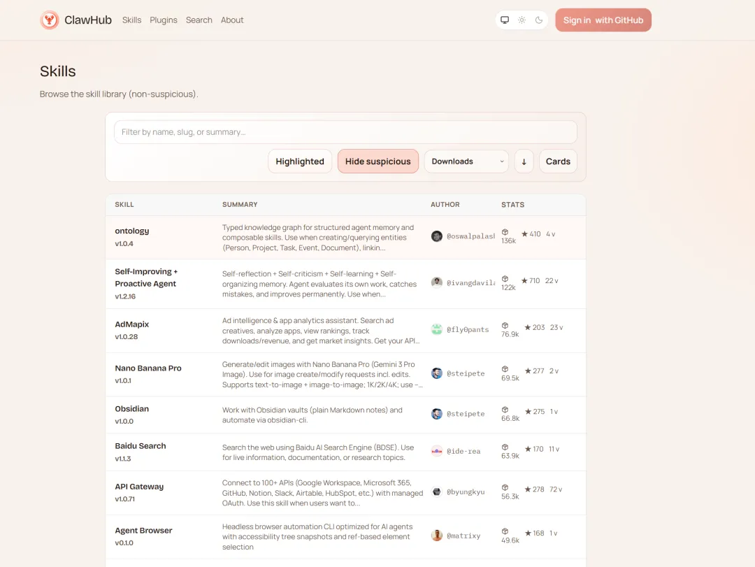 ClawHub,OpenClaw 的技能市场。你可以理解成小龙虾的淘宝——一万三千多个技能插件,琳琅满目,一键安装。