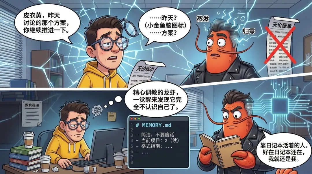 后来肚腩哥翻了半天教程,终于搞明白了,连夜创建了一个 MEMORY.md 文件。他把所有重要的东西都往里塞:要简洁、不要废话、当前在做什么项目、哪些格式他看了就来气……