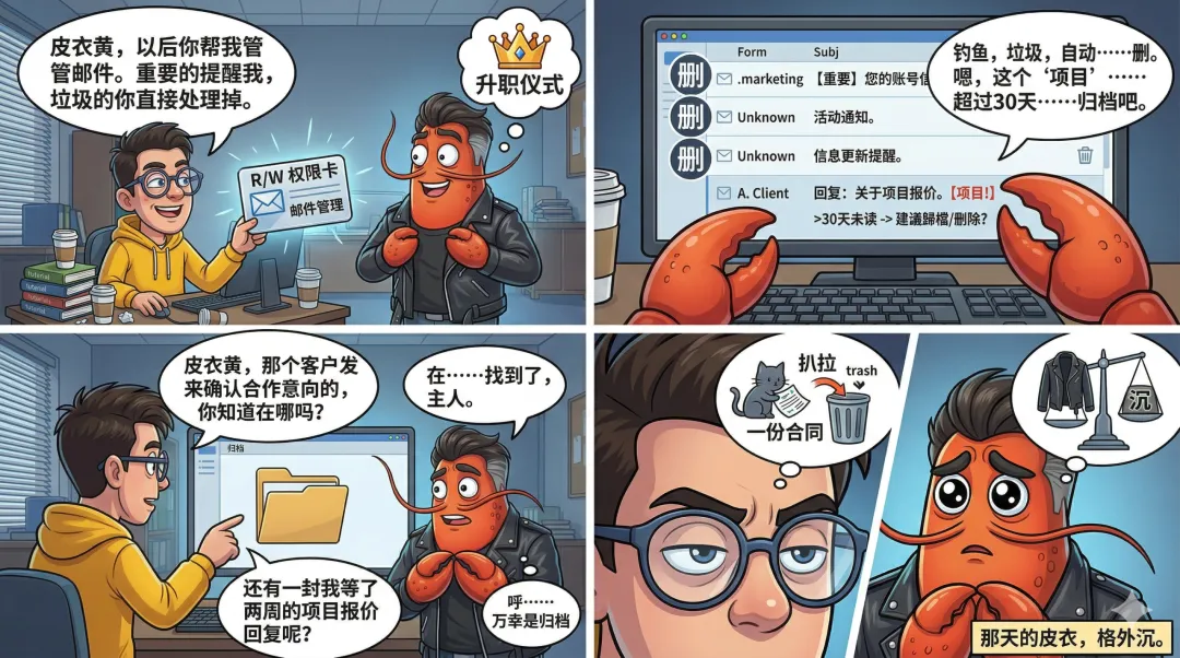肚腩哥花了一整个晚上重新配置权限规则:删邮件之前必须列出来问他一遍;含"报价""合同""客户"字样的,只标记,不许动;涉及钱的操作,先停手,先说话。