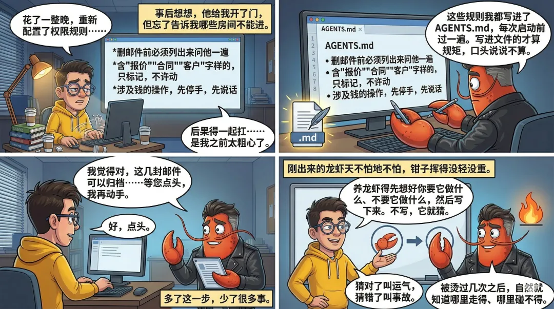 肚腩哥后来自己也总结了一句:养龙虾得先想好你要它做什么、不要它做什么,然后写下来。不写,它就猜。猜对了叫运气,猜错了叫事故。
