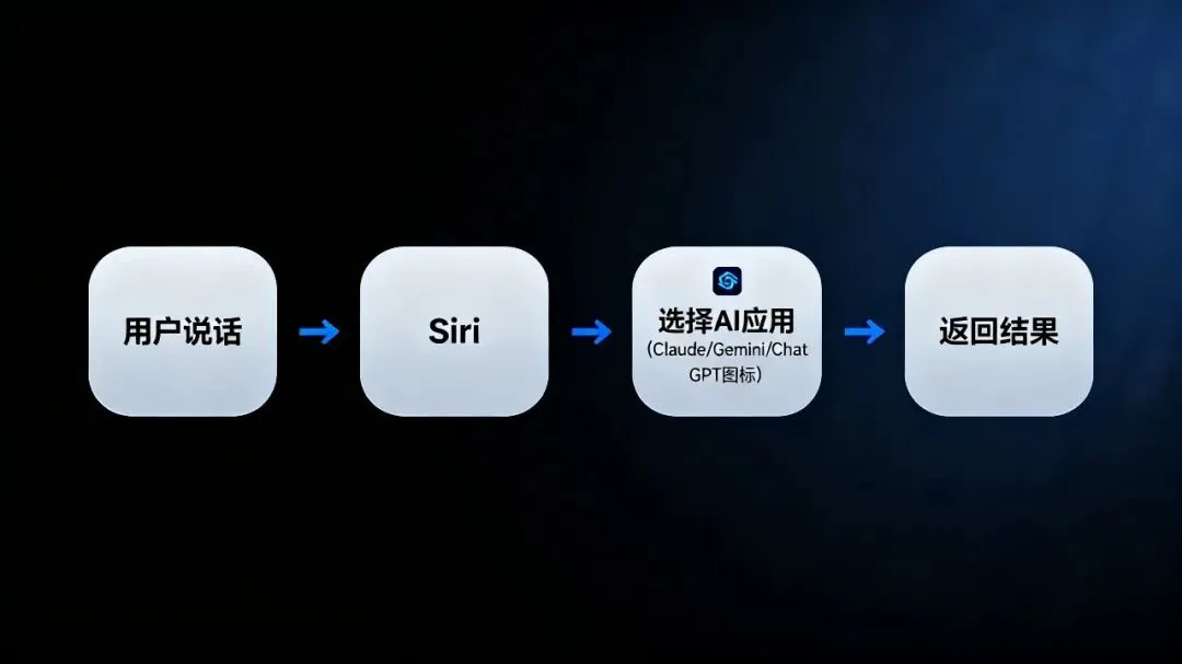 以后你对 Siri 说"帮我写封邮件",Siri 可以直接调用你手机上安装的 Claude、Gemini、ChatGPT 等 AI 应用来完成,而不是只能用苹果自家的智能功能。