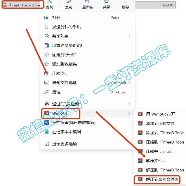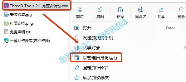 2.打开刚刚解压的文件夹,鼠标右键点击“ThreeD Tools 2.1 完整安装包.exe”选择“以管理员身份运行