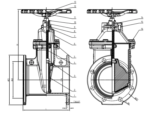 原理:闸板升降实现通断,流道直通,阻力极小 优点:密封好、流阻小、耐高温、可判断开度、适配悬浮颗粒介质 缺点:结构复杂、安装尺寸大、密封面易磨损、启闭费力(高压差) 用途:大口径(DN>50)、不频繁启闭、高密封要求场景——给排水主干管、蒸汽主管、石油管线 安装要点:水平安装阀杆向上;关闭后回调1/4圈防咬死(GB/T 46814-2025);大口径配旁路阀平衡压差