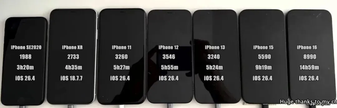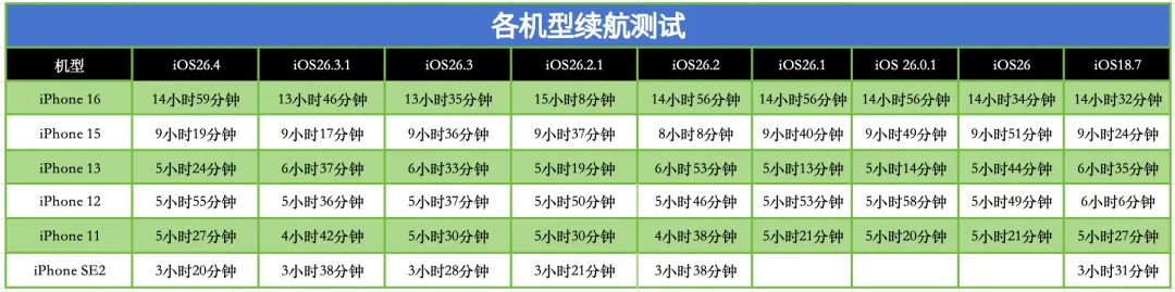 iOS 26.4 正式版续航出炉,这款 iPhone 续航大提升!iOS 26.4 正式版带来了主屏幕、控制中心液态玻璃减弱、全新的表情符号、主屏幕「编辑」液态玻璃效果、无边记图标重新设计、壁纸新增了获取和移除、修复了快速打字遗漏字符的问题。iAppleBytes 博主测试了iOS 26.4 正式版续航,这次测试的机型依旧是iPhone16、15、13、12、11、SE2。6款机型电池健康如图所示:测试的机型相同亮度、根据Geekbench电池测试功能,记录每款iPhone从100%的电量直到自动关机时间。6款机型测试结果如下:从测试结果来看,对比iOS 26.3.1来看。iPhone 16续航增加73分钟、iPhone 15续航增加2分钟、iPhone 12续航增加19分钟、iPhone 11续航增加45分钟iPhone 13续航下降73分钟、iPhone SE2续航下降18分钟升级建议:整体对比上个版本,iPhone 16和iPhone 11续航增加最明显。iPhone 13续航下降最明显。以上就是iOS26.4 正式版续航结果,仅测试数据,不代表日常使用,不代表大家最终结果,仅供参考。iOS 26.4 正式版发布几天,大家体验如何?