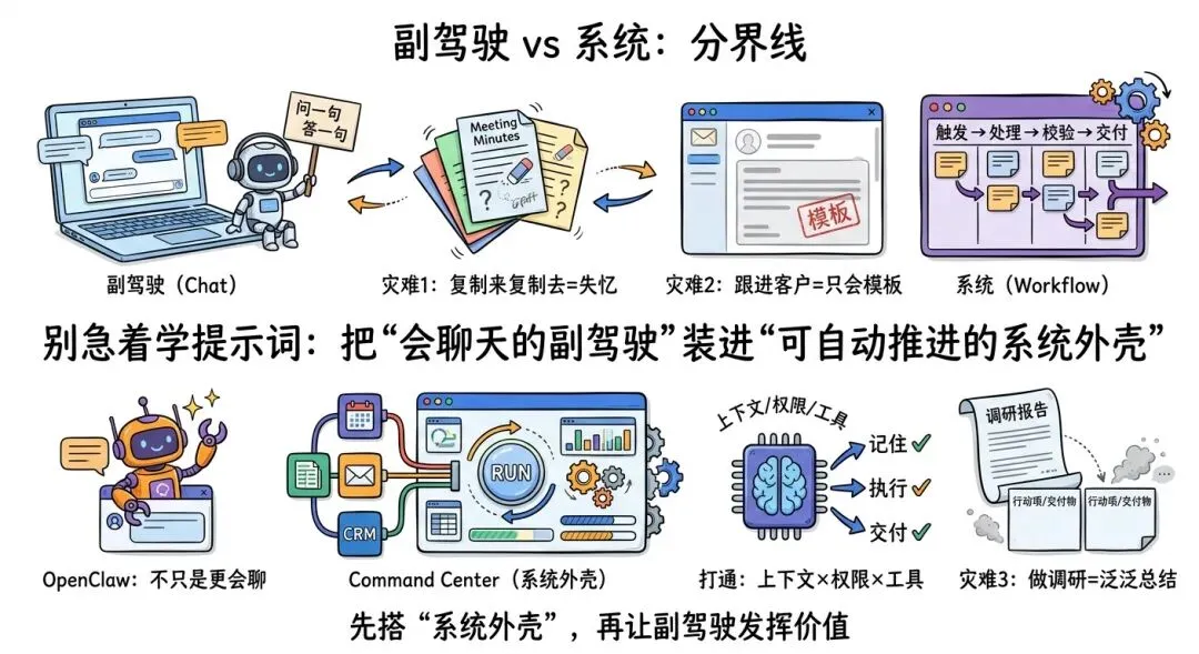 你把会议纪要复制来复制去,它每次都像失忆你让它“跟进客户”,它只会给你一封模板邮件你让它“做调研”,它给你一堆泛泛总结,没有行动项、没有交付物、没有落地