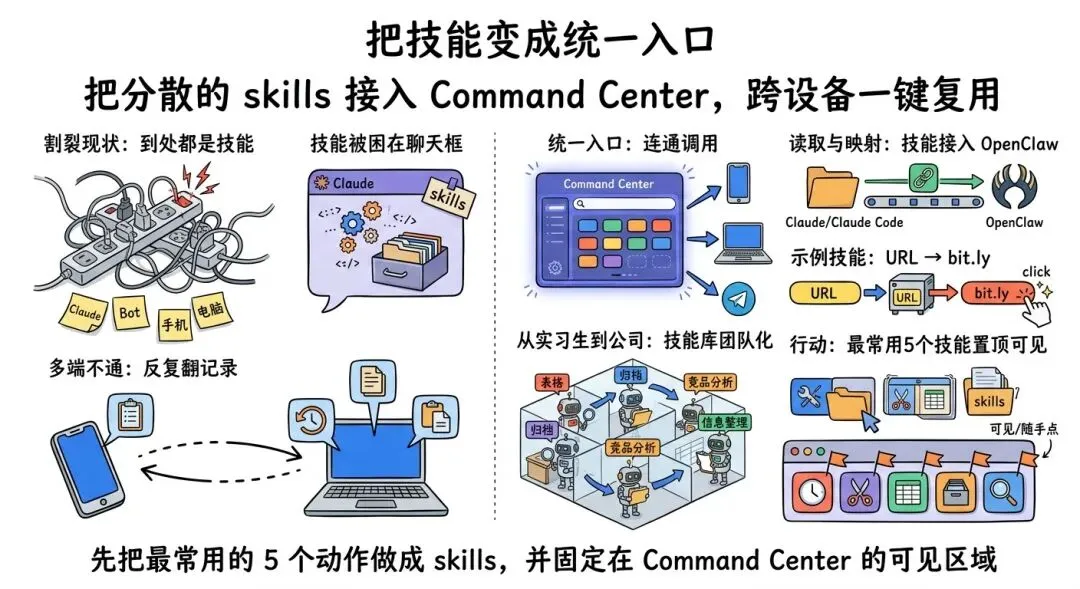 你在 Claude/Claude Code 里写过的 skills,可以被 OpenClaw 读取这些 skills 可以被“映射”到 OpenClaw 的统一入口(Claude bar / Command Center)然后你在手机上、Telegram 里、任何地方,像点外卖一样直接调用