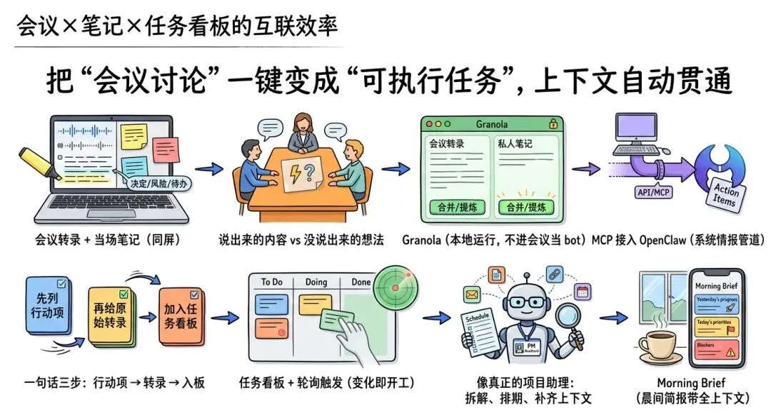 他重点讲了一个工具:Granola。和 Fireflies/Fathom 不同,Granola 不会以 bot 身份闯进会议,它是在你电脑上跑的——你可以边开会边记笔记,而且能通过 MCP 接进 OpenClaw。