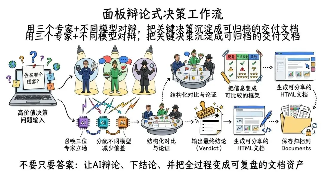 04 “面板辩论”把决策质量拉满:三个专家、不同模型、输出成文档归档