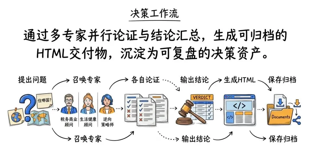 召唤三位专家(税务商业顾问 / 生活方式健康顾问 / 逆向策略师)各自给出论证最后输出 verdict(结论)生成一个漂亮的 HTML 文档保存到 Documents 文件夹,随时可回看、可下载