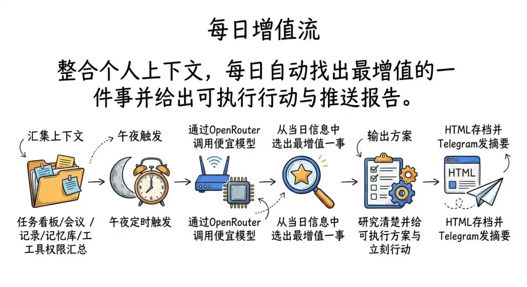 基于当天讨论、记忆、任务清单找出“对我增值最大的一件事”研究清楚,给可执行方案说明为什么有价值、会带来什么改变给一个立刻可做的行动输出成 HTML 存档 + Telegram 发摘要