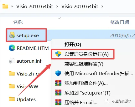 2.打开刚刚解压的文件夹,双击打开“Visio 2010 64bit“文件夹,鼠标右键点击“setup.exe”选择“以管理员身份运行”