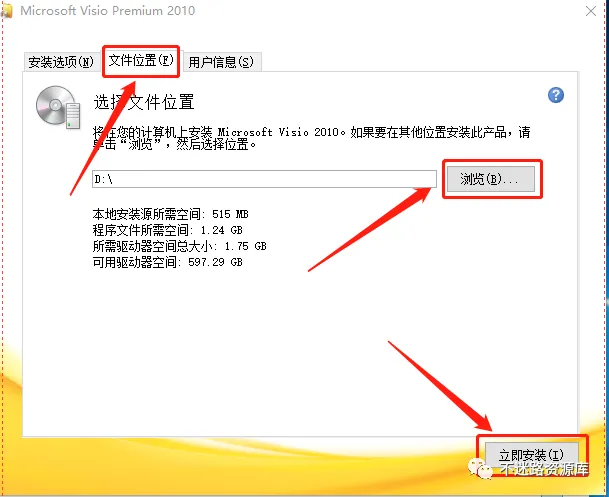 5.鼠标点击“文件位置“,选择软件安装路径,建议和教程中的保持一致,本例安装到D盘(将路径地址中的首字符C改为D表示安装到D盘,或者可以在其它磁盘里创建一个新的文件夹,安装路径不要出现中文),点击“立即安装“