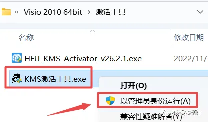 8.返回之前解压的“Visio 2010 64bit”文件夹,双击打开“激活工具”文件夹,选中“HEU_KMS_Activator_v26.2.1.exe”或者“KMS激活工具.exe”其中一个,鼠标右键点击“以管理员身份运行”