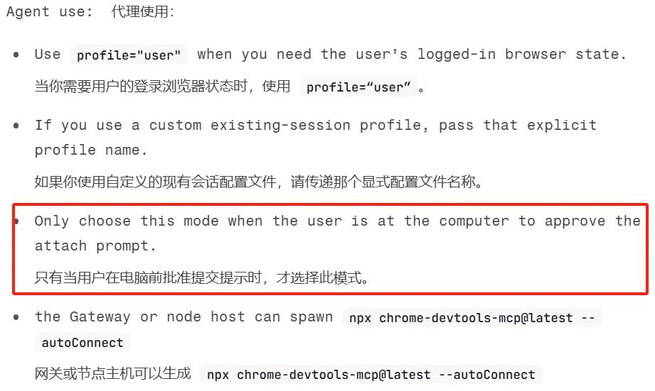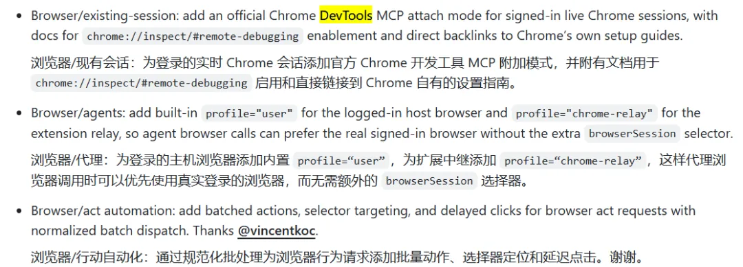 但是随着版本更新,目前已经不推荐chrome扩展插件这种方式了(官方文档中,也没有对此方法的介绍了),在2026.3.13的版本中,就已经添加了对Chrome DevTools MCP的附加支持。并在后续的多个版本中持续优化。