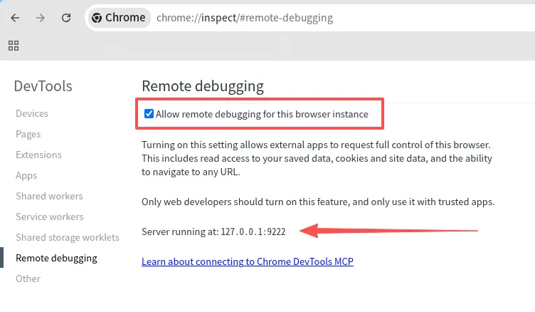 需要注意的是,Chrome DevTools MCP会授予AI对你的浏览器实例的完全控制权,包括读取Cookies、站点数据和浏览历史等。