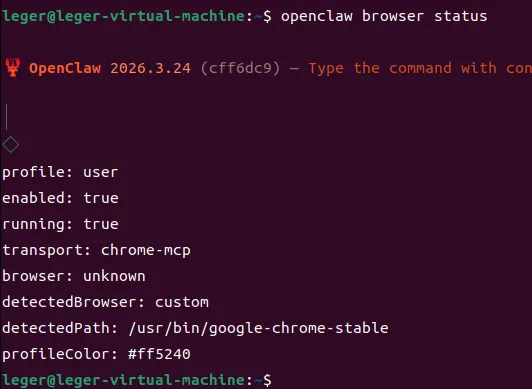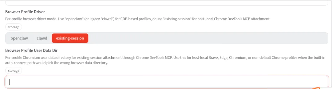 "browser": {"enabled": true,"defaultProfile": "user","executablePath": "/usr/bin/google-chrome-stable","profiles": {"user": {"cdpPort": 9222,"driver": "existing-session","color": "#ff5240"}}},
