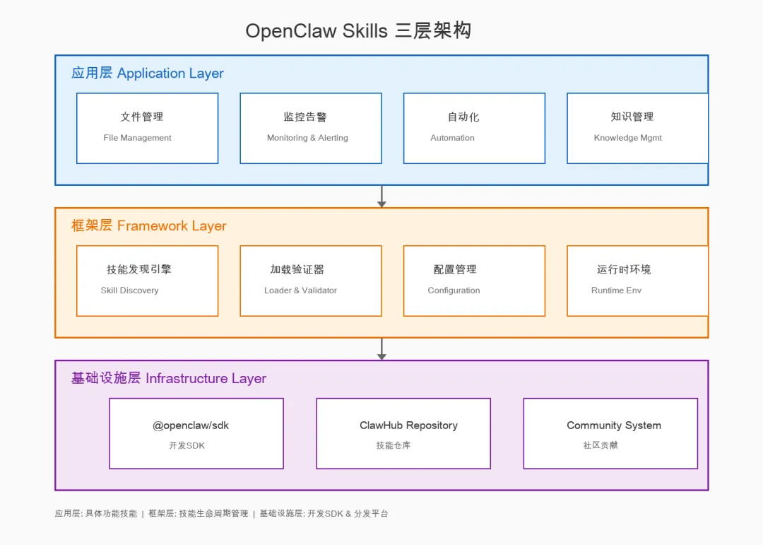 OpenClaw的Skills生态采用三层架构,确保扩展性与稳定性: