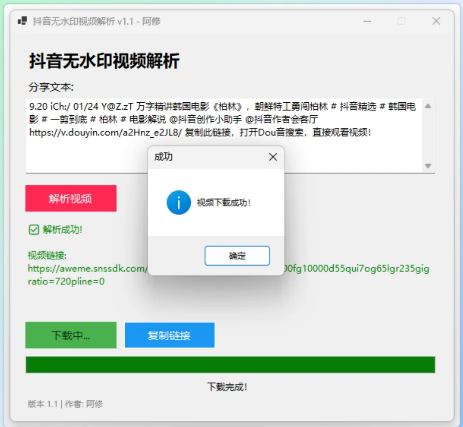 DY无水印下载视频工具大家好,我是瓜妹。工具软件均来自于网络公开平台,只做免费分享,如在软件中出现收费情况,请仔细斟酌。记得关注本公众号,每天都会分享实用免费工具。文章末尾自行获取————————————————————不少朋友在找DY解析工具,能够下载无水印的视频,今天瓜妹分享一款用的比较不错的,有需要的文末自己拿。这款工具体积非常小,而且非常的简洁,基本只要你认识中文就能用。1、将DY分享链接复制粘贴到文本框,点击“解析视频”,点击“下载视频”。2、设置保存的文件夹3、下载的速度还是很稳定的,下载后就是无水印的视频了。目前瓜妹在逐步晚上资源表格,可以直接在私信回复“资源”或菜单栏自取。————————————无水印下载工具:https://pan.quark.cn/s/527982040e67————————————