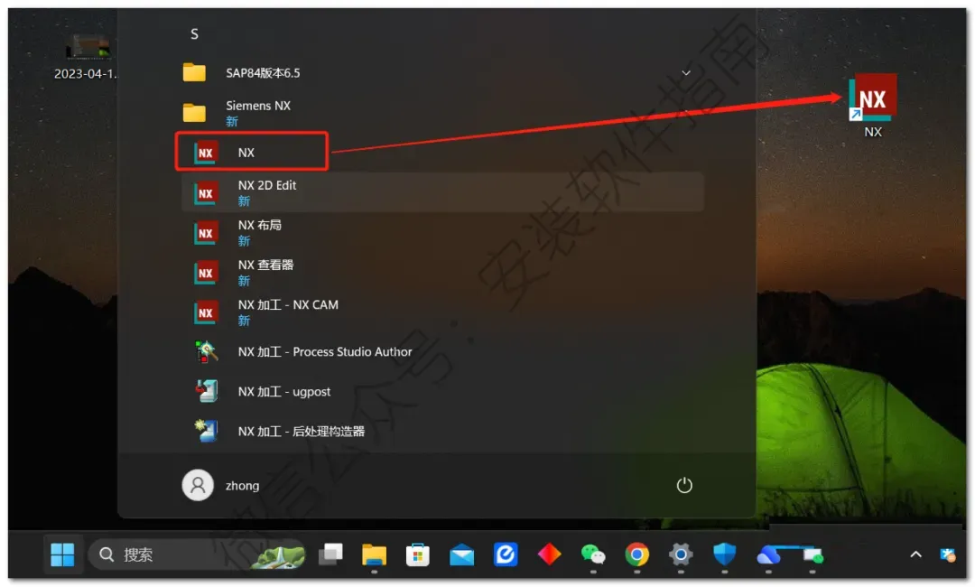 31.创建桌面快捷方式:点击桌面任务栏中的【开始图标】>所有应用>Siemens NX,将【NX】图标拖到电脑桌面