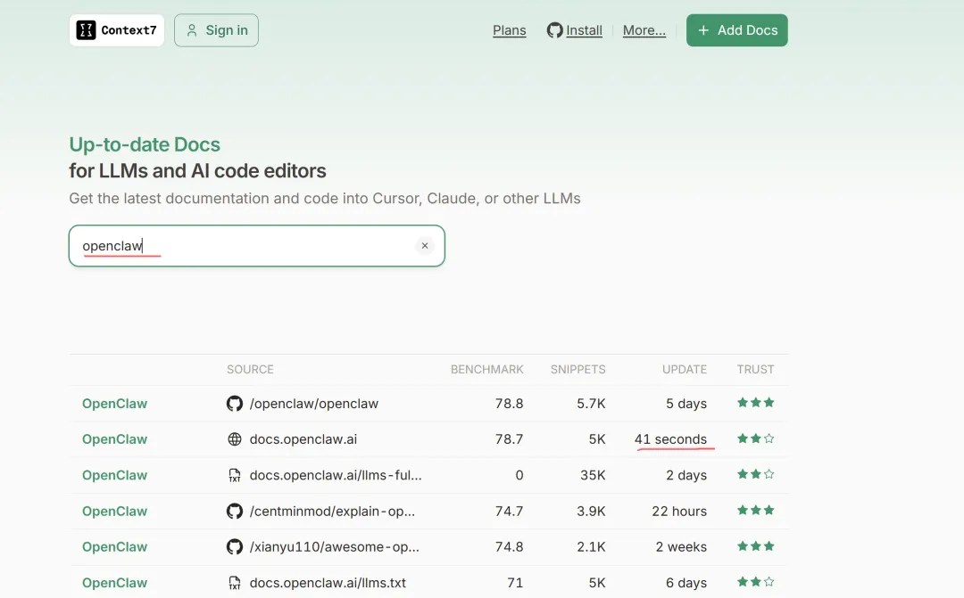 这是一个提供最新文档的网站。比如openclaw部署、配置出现的问题、定时任务就是不运行等问题,只需在context7里面搜索openclaw,然后将文档复制到claude 或其他AI编辑器中,定能找到问题的解决答案。