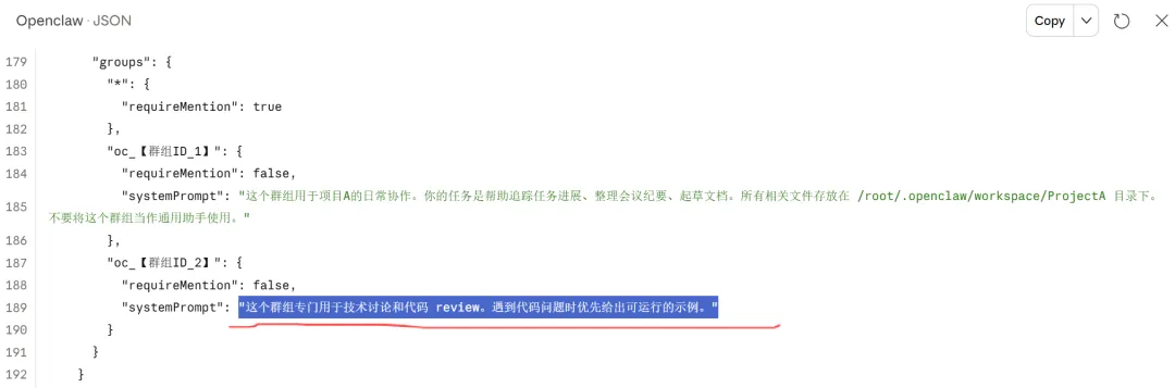 5 / 如何优化使用openclaw进行聊天在openclaw.json中针对不同的群组和主题设置系统提示systemPrompt(channels.groups下边),openclaw就能记住在这个组内实际正在做什么。