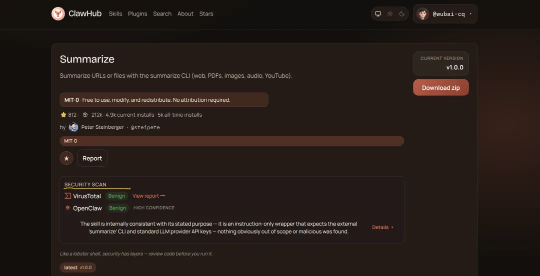 clawhub官方市场,这里可以浏览技能并进行搜索,有一点需要注意,一定需要反复检查这些技能,因为任何人在这里可以创建这些技能,其中包含一些恶意内容,可以去看看评论,看看这项技能是否通过安全扫描(securityscan)。