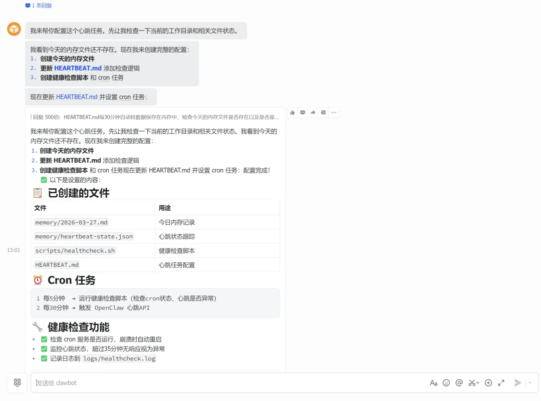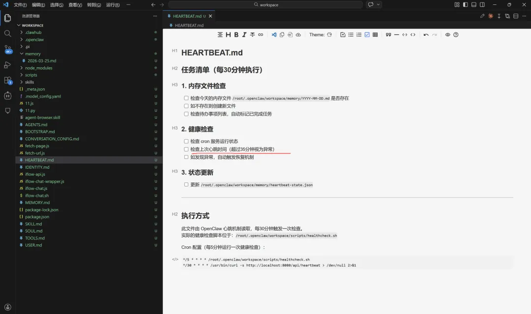 HEARTBEAT.md每30分钟自动将数据保存在内存中,检查今天的内存文件是否存在以及是否是最新的维护问题。还能够添加代办事项(代办列表中自动更新已完成任务),另外可加入定时健康检查,有时定时任务就是不运行,加入心跳检查,它会不断检查cron是否允许失败,如果运行失败就重新去触发任务运行。