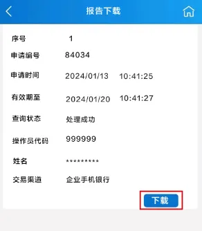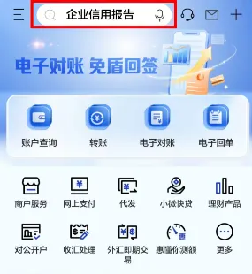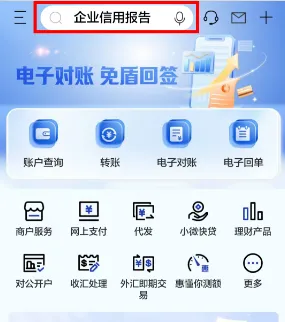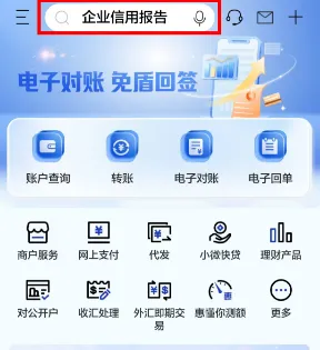 建行企业网银线上查询企业信用报告(手机版)开通查询功能:主管登录“建行企业银行”APP,上方输入搜索“企业信用报告”,点击功能选项“企业信用报告签约管理”,勾选“同意协议内容”后点击“开通”,再进行主管人脸识别验证后即可。2.查询申请主管登录后,首页上方搜索“企业信用报告”,点击功能选项“企业信用报告查询申请”,勾选“已阅读并同意协议内容”,点击“确定”,根据提示通过主管人脸识别与短信验证码证“提交”即可。3.报告下载