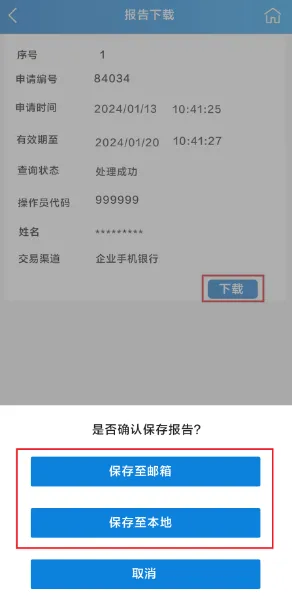 主管登录后,首页上方搜索“企业信用报告”,点击功能选项“企业信用报告下载”,选择起止日期后点击“确定”,进入报告下载界面,点击“下载”按钮后选择将报告保存至本地或邮箱,再根据页面提示操作即可。1.企业信用报告查询有次数限制吗?有的,查询次数为每日1次,每月3次,每年12次。2.企业信用报告生成后可保留多久?企业信用报告生成后系统只保留7天,过期后将自动清除报告信息,请您在7天内完成下载、邮箱发送等操作。