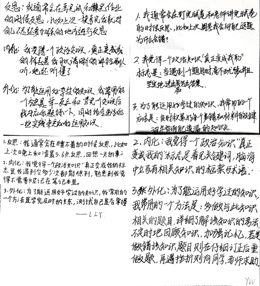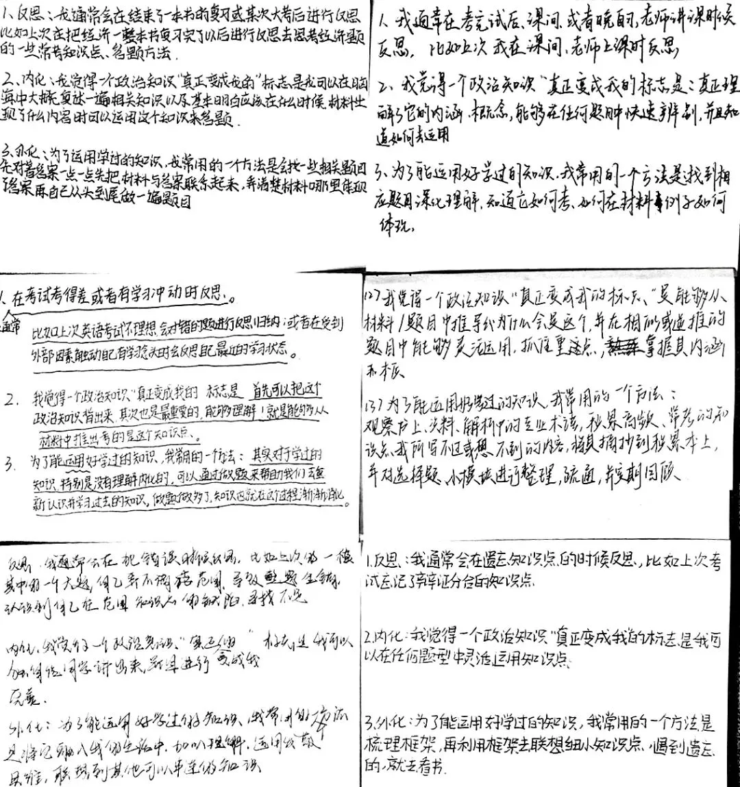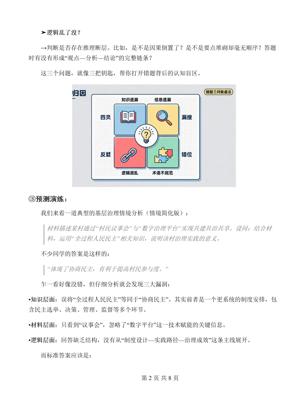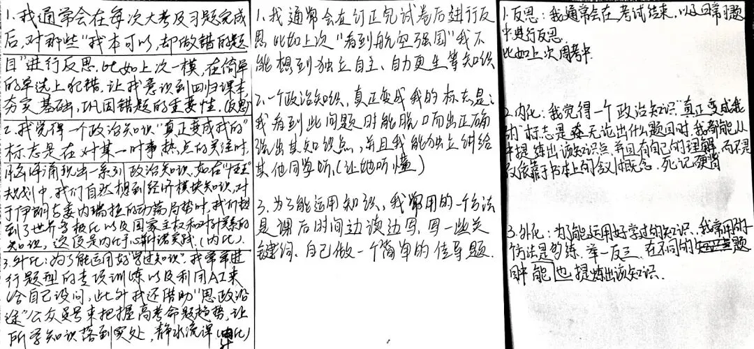 1.反思:从"找错"到"防错":多数同学能抓住关键时机,考后、讲评时、甚至课间。有人提到"我本可以,却做错的题",说明能直面失分点;有人说"在意识不到的时候就开始反思",这其实是一种难得的自觉。反思不是为了自责,是为了找到那个"卡住"的地方。建议下次多想一步:这个错误如果下次再出现,我提前做什么能拦住它? 把反思变成一条具体的小规矩,比如"材料题先划主体"。