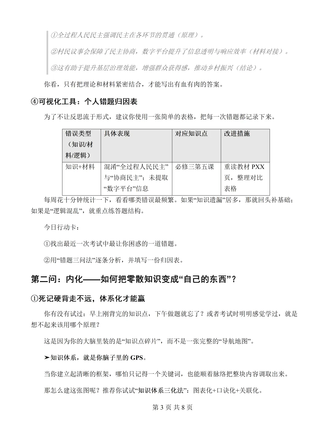 3.外化:把理解"亮"出来:大家提到的方法挺丰富:多做题、举一反三、梳理框架、找对应题目练……这些都是好路子。外化的关键是让别人能看懂你的思路。建议给自己加一条规矩:平时练题就限时、规范、分点作答,做完后对照参考答案,看看自己的表述差在哪。是术语不准?还是逻辑链条断了?找到差距,下次就能写得更扎实。