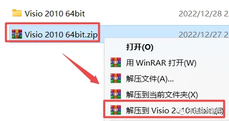 1.选中下载的压缩包,然后鼠标右键选择解压到"Visio 2010 64bit"(没有解压选项点这里)