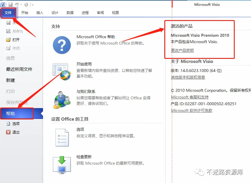 13.在打开的Visio界面点击左上角的“文件“选项,点击“帮助”,在产品信息中可以查看是否激活成功,激活成功如下图,显示为激活的产品