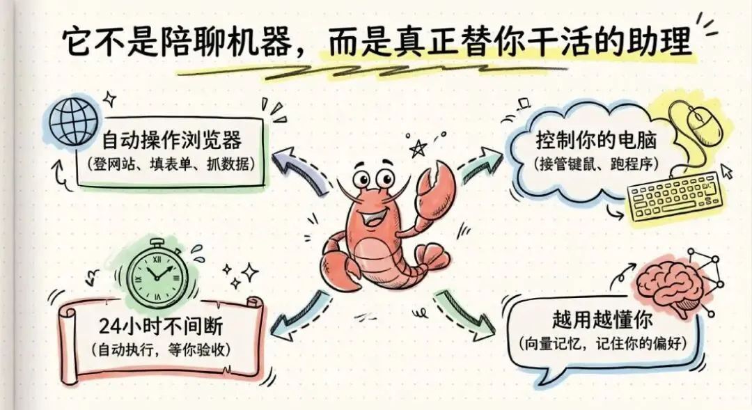 • 自动操作浏览器:登网站、填表单、截图、抓数据,网页上能干的,它全干 • 控制你的电脑:装软件、写代码、跑程序、监控任务,鼠标键盘它都能接管 • 24 小时不间断运行:你甩给它一个任务,它自己拼命搞定,完事等你验收 • 越用越懂你:向量记忆模块,用的次数越多,它越知道你的习惯和偏好