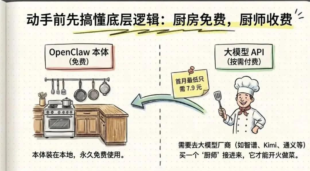 OpenClaw 本体就像你家装修好的厨房——设备齐全,但没有厨师,做不出菜。
