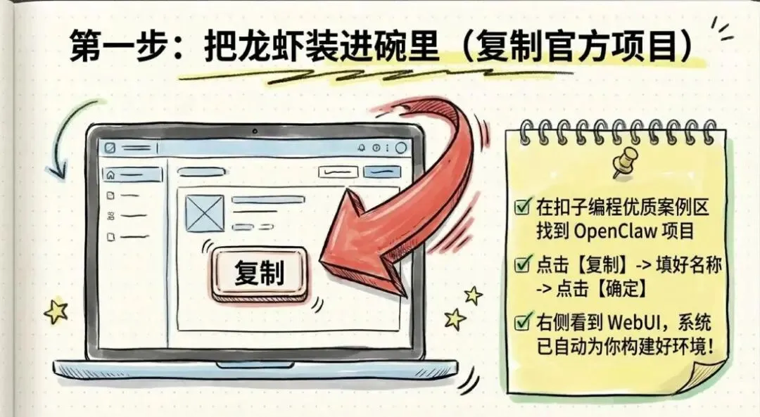 填好项目名称和介绍,点「确定」。复制完成后,系统自动构建环境,右侧「预览」页面能看到 OpenClaw 的 WebUI——到这里,龙虾已经在你碗里了。