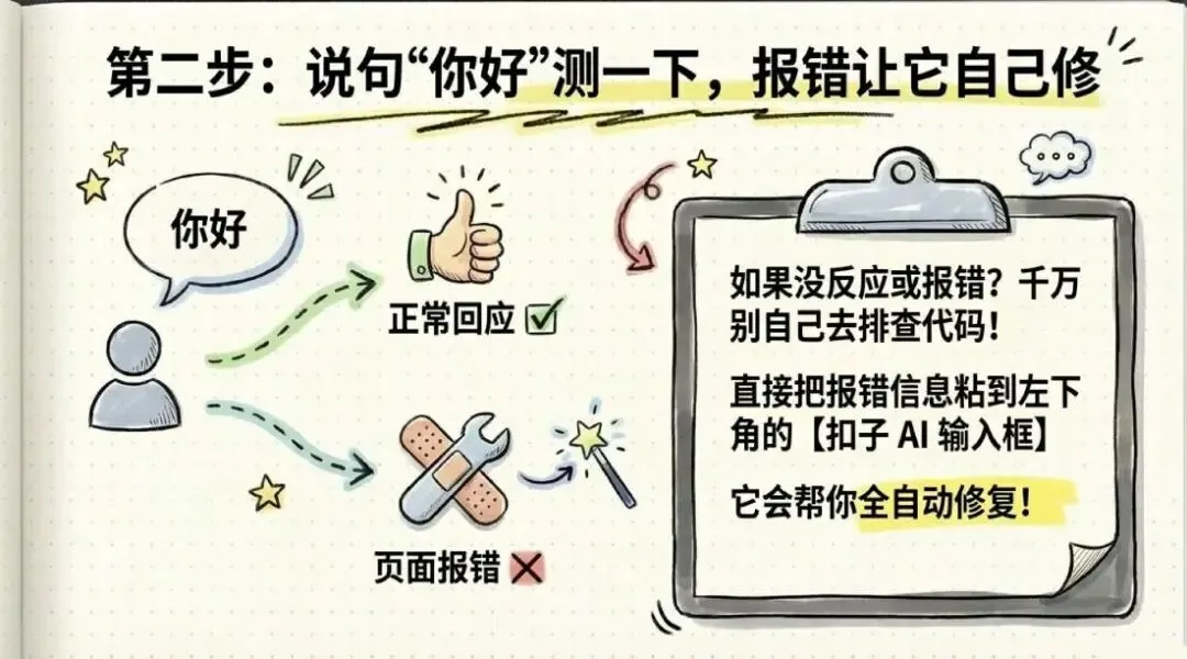 如果没反应、页面报错——不要慌,也不要自己去排查。直接把报错信息复制,粘到左下角的扣子 AI 输入框里,它会帮你自动修复。