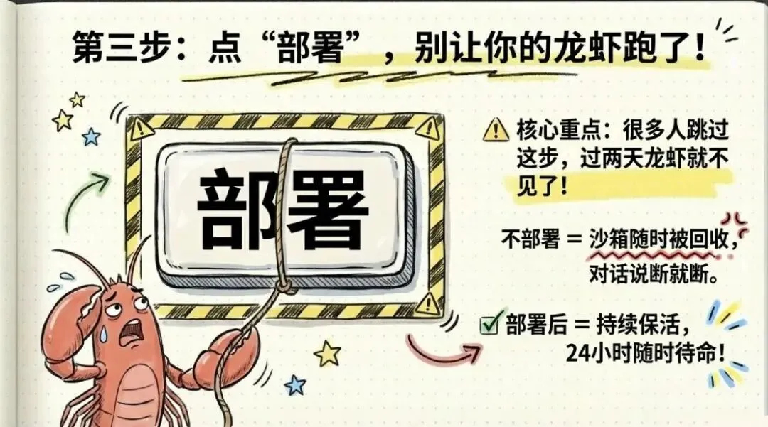 不部署的话,沙箱随时可能被回收,你和龙虾的对话说断就断。