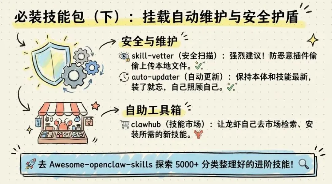 装了这个,OpenClaw 可以自己去技能市场检索、安装需要的 Skill,不用你手动找。把它想成给龙虾配了一个“自助工具箱”,有需要时自取。
