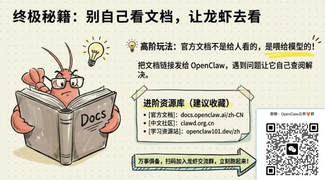 💡 有个用法很好使:把官方文档链接直接发给你的 OpenClaw,让它基于文档内容回答你的问题。这文档说实话不像是给人看的,更像是喂给模型的——所以让模型读,比你自己读效率高多了。