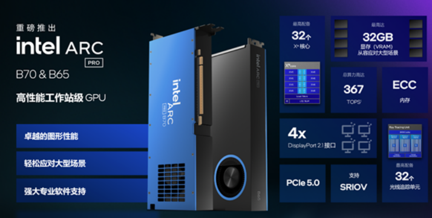 Intel正式推出了锐炫Pro B70和B65两款工作站显卡,均搭载代号为BMG-G31的Big Battlemage GPU,配备32GB GDDR6显存,面向本地AI推理、软件开发和专业图形应用场景。