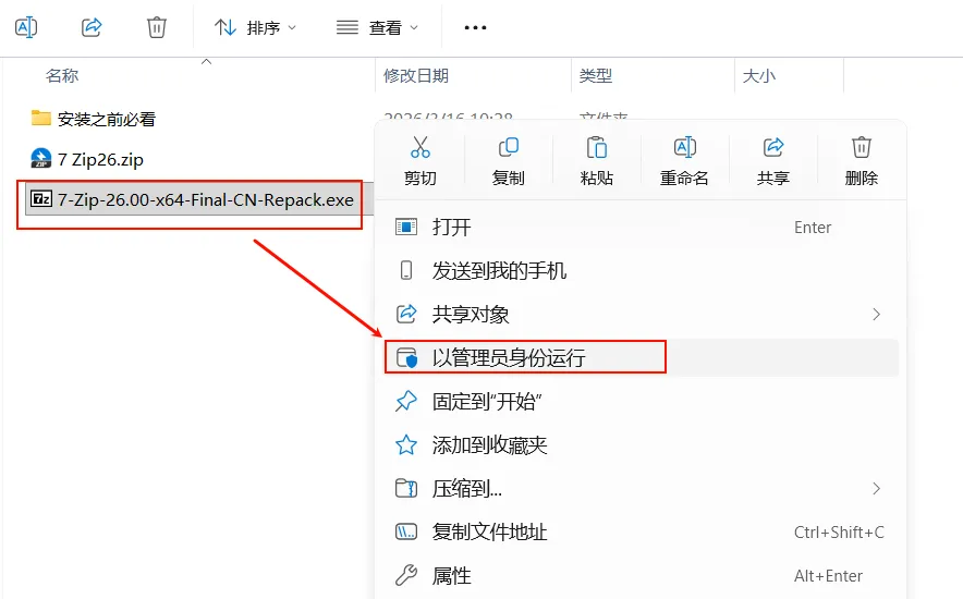 1.选中“ 7-Zip-26.00-x64-Final-CN-Repack.exe”右键以管理员身份运行