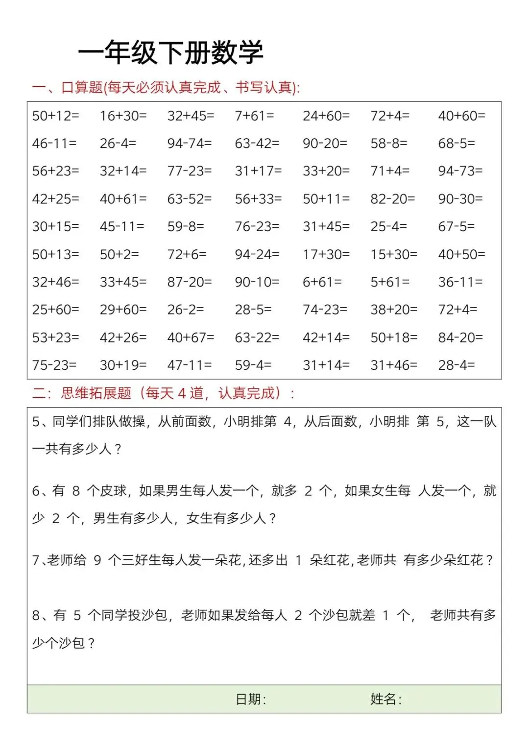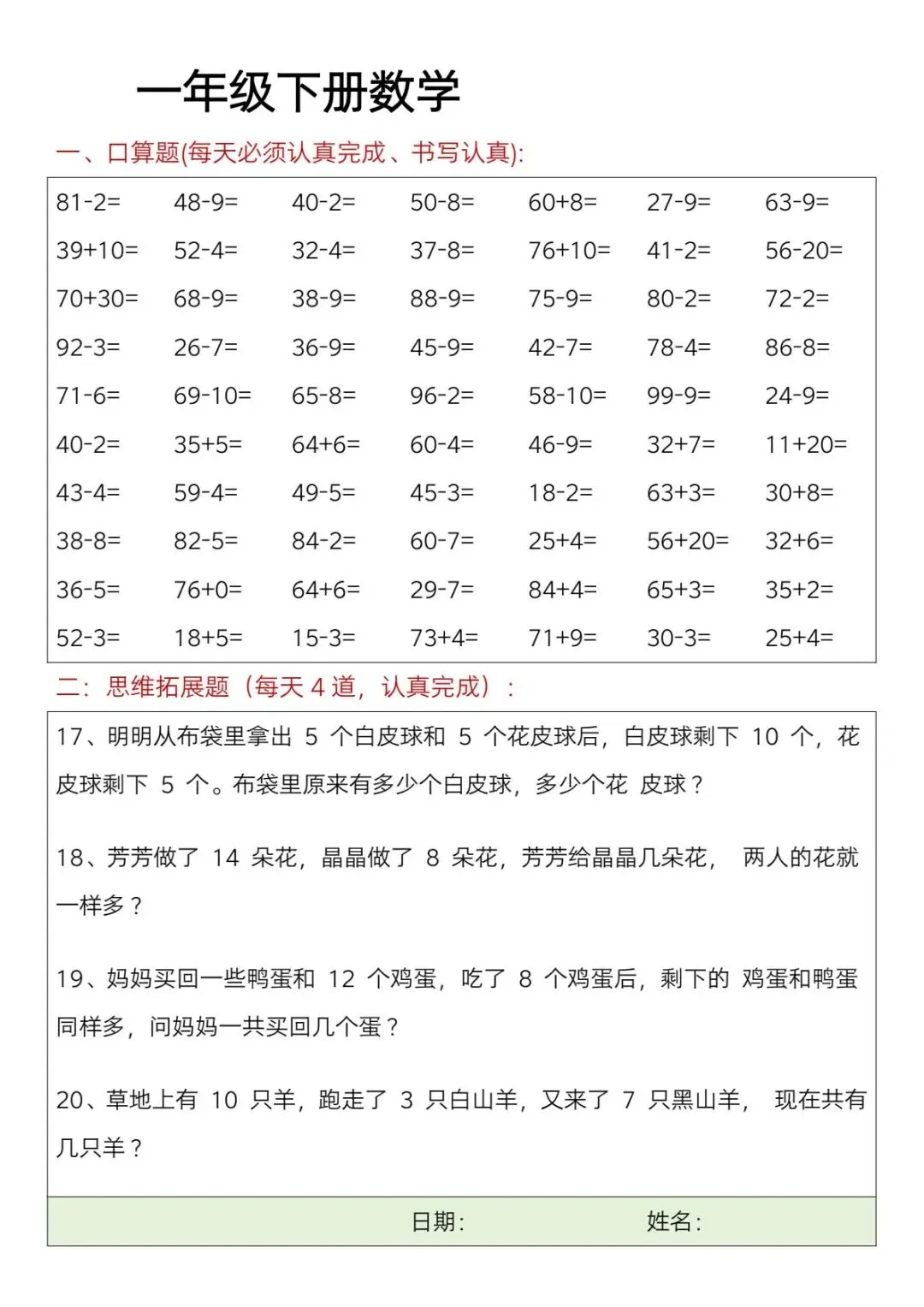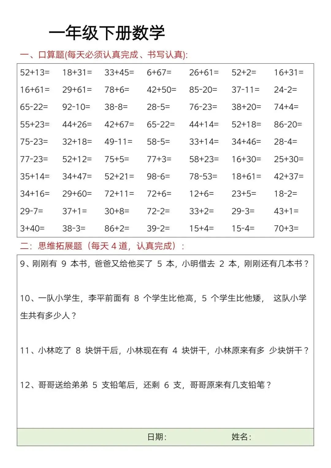 这份一年级下册数学思维训练每日一练【可下载可打印】完整电子版共23页