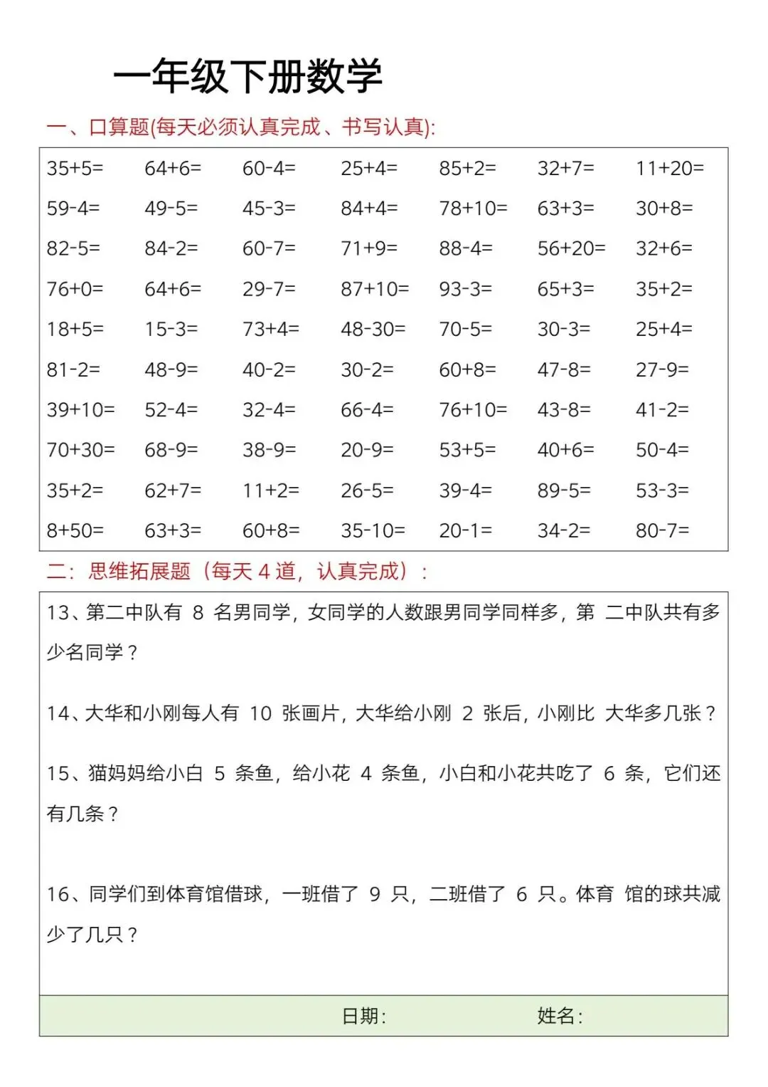 大家好,今天给大家分享的是一年级下册数学思维训练每日一练【可下载可打印】,关注我,每天持续分享更多的优质学习资料。