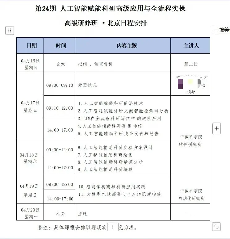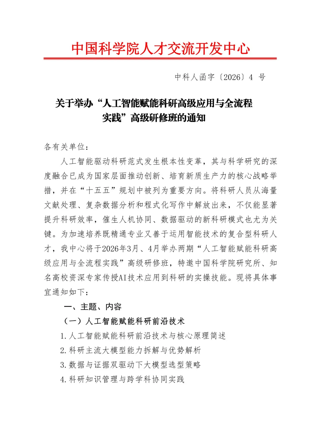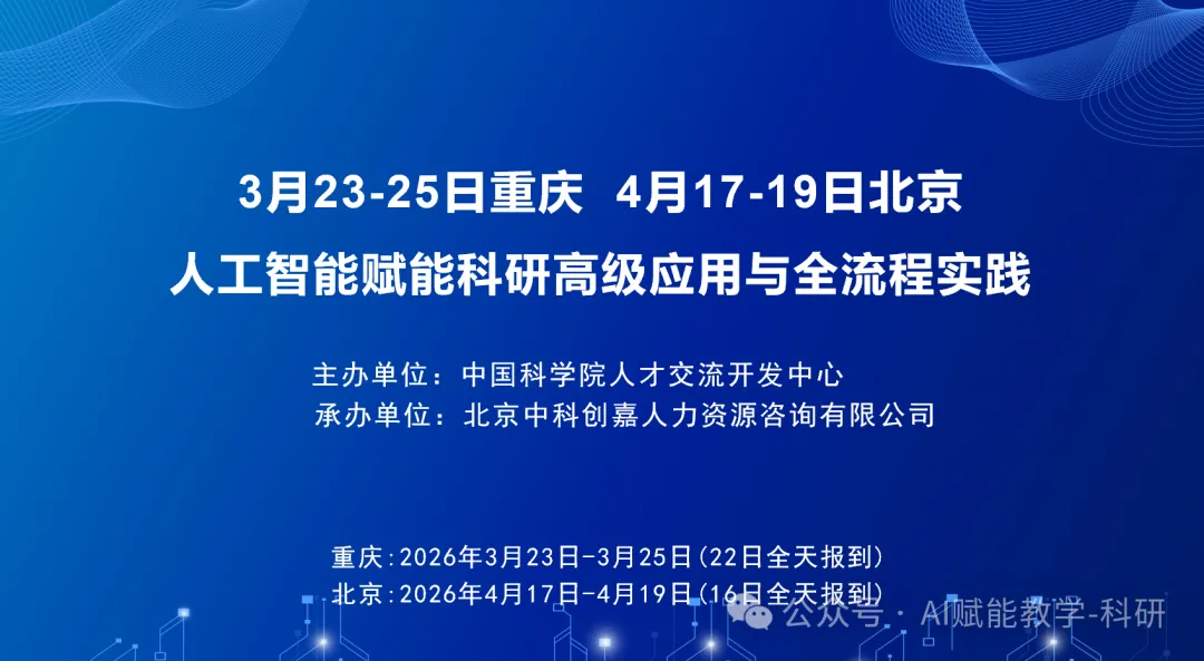 人工智能驱动科研范式发生根本性变革,其与科学研究的深度融合已成为国家层面推动创新、培育新质生产力的核心战略举措,并在“十五五”规划中被列为重要方向。将科研人员从海量文献处理、复杂数据分析和程式化写作中解放出来,不仅能显著提升科研效率,催生人机协同、数据驱动的新科研模式也尤为关键。为加速培养既精通专业又善于运用智能技术的复合型科研人才,我中心将于2026年4月举办两期“人工智能赋能科研高级应用与全流程实践”高级研修班,特邀中国科学院研究所、知名高校资深专家传授AI技术应用到科研的实操技能。现将具体事宜通知如下: