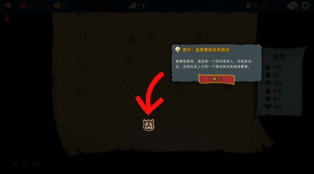 5、选一个房间进入,完成房间后,选择在其上方的一个相邻房间继续攀登。