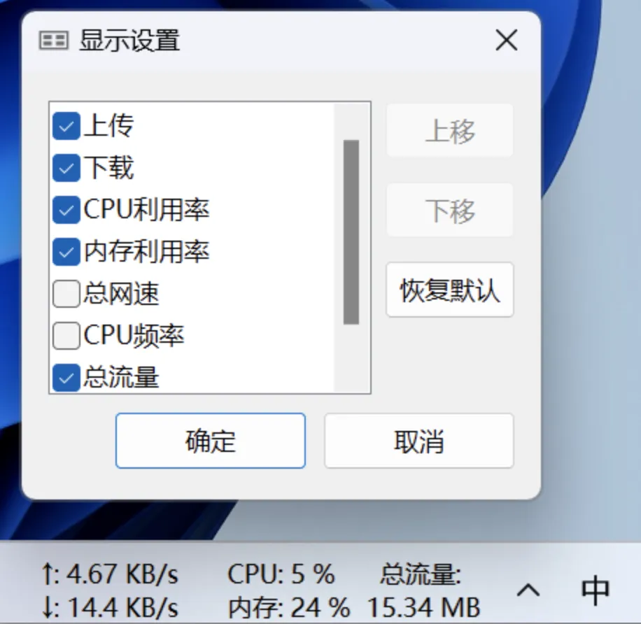 默认显示上传、下载速度。可以通过设置,显示出:CPU、内存等的监控。